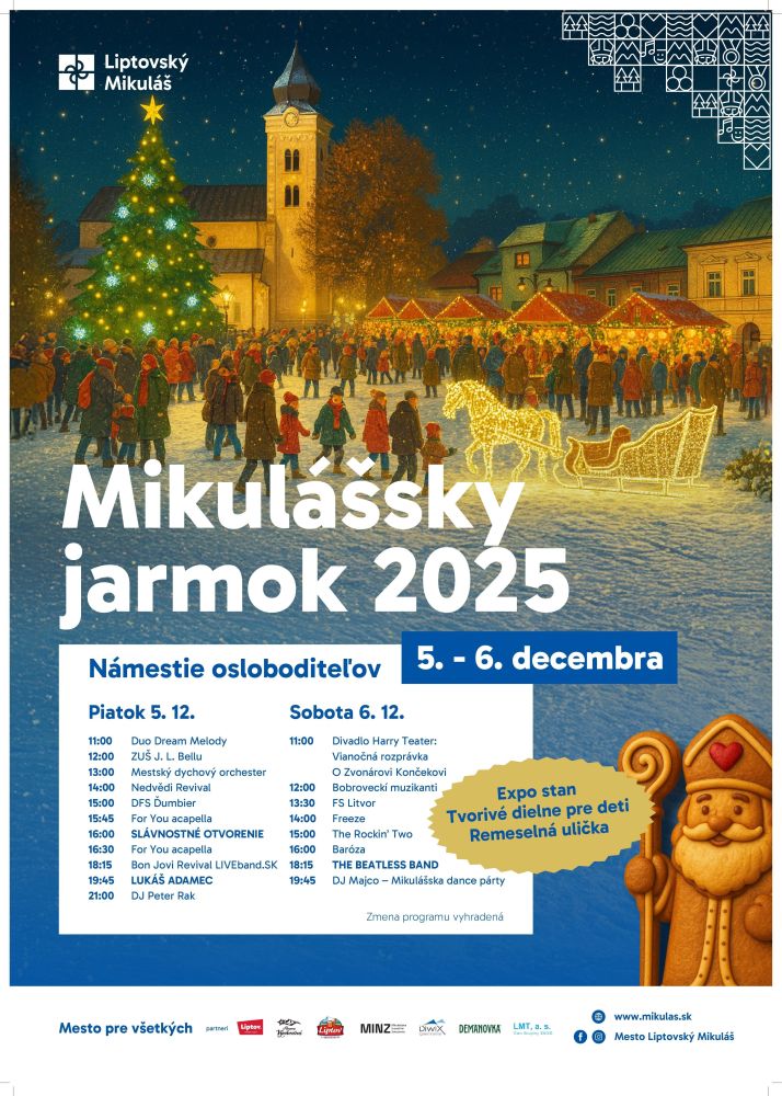 Pozývame vás na každoročný Mikulášsky jarmok. Čaká na vás bohatý kultúrny program a jarmočný predaj s vianočnou tematikou. V piatok vystúpi Lukáš Adamec a DON JOVI Revival LIVEband. Sobota bude patriť detskej rozprávke, vystúpeniu Freezy a kapele THE BATLESS BAND.
