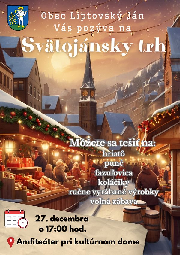 Určite nevynechajte ani Svätojánsky trh, ktorý sa uskutoční 27. decembra 2025 o 17:00 hod. v amfiteátri kultúrneho domu v Liptovskom Jáne. Všetci ste srdečne vítaní, aby sme si spoločne vychutnali vianočnú atmosféru a chuť a vôňu vianočných dobrôt!