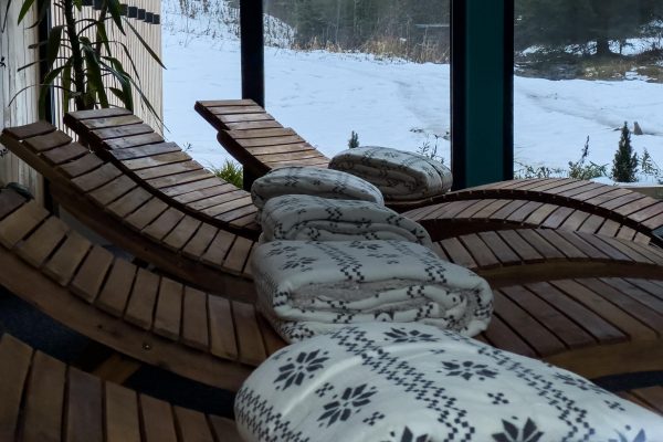 Okrem samotnej sauny je k dispozícii aj relaxačná miestnosť s otvoreným výhľadom na okolitú prírodu a vonkajšie drevené mólo.