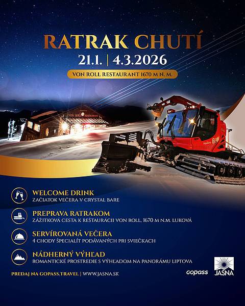 - Adrenaline snow groomer ride from Priehyba to Luková – Even the journey to the restaurant is an adventure in itself. You will take the cable car from Biela Púť to Koliesko, where you will board a specially adapted snow groomer (called Tatrak) and this will take you through a snowy landscape to 1,670 metres. Stunning views, fresh mountain air and the calm of nature form the perfect prelude to your evening.