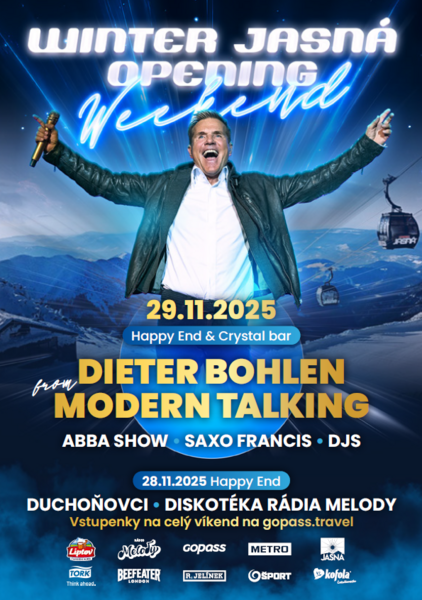 We’re opening the new 2025/26 ski season in Jasná on the last November weekend! This year, we’ll party with DIETER BOHLEN – MODERN TALKING as the main star, and you can look forward to an opening packed with a varied day and evening programme starting already on Friday, 28th November 2025