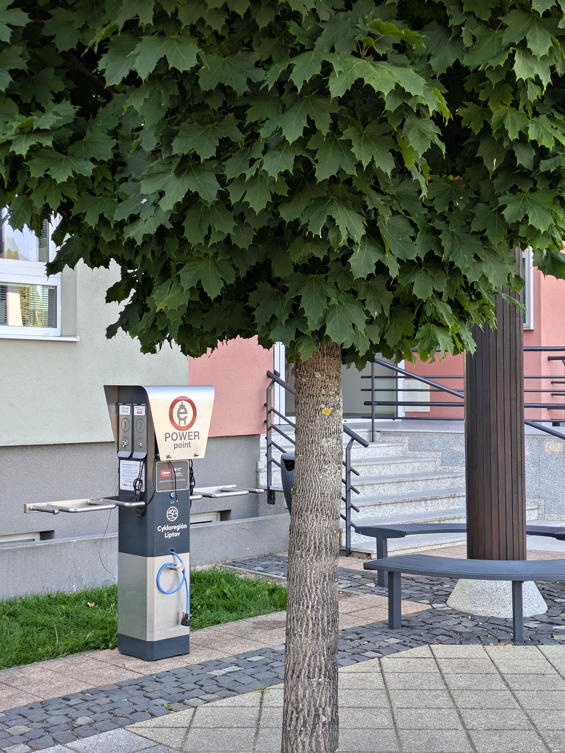 ePOWERpoint e-bike charging station is located right in front of the City hall of Liptovský Hrádok. The station is located on the main square, on the left side of the main entrance to the city hall. You can find a pub/restaurant nearby.