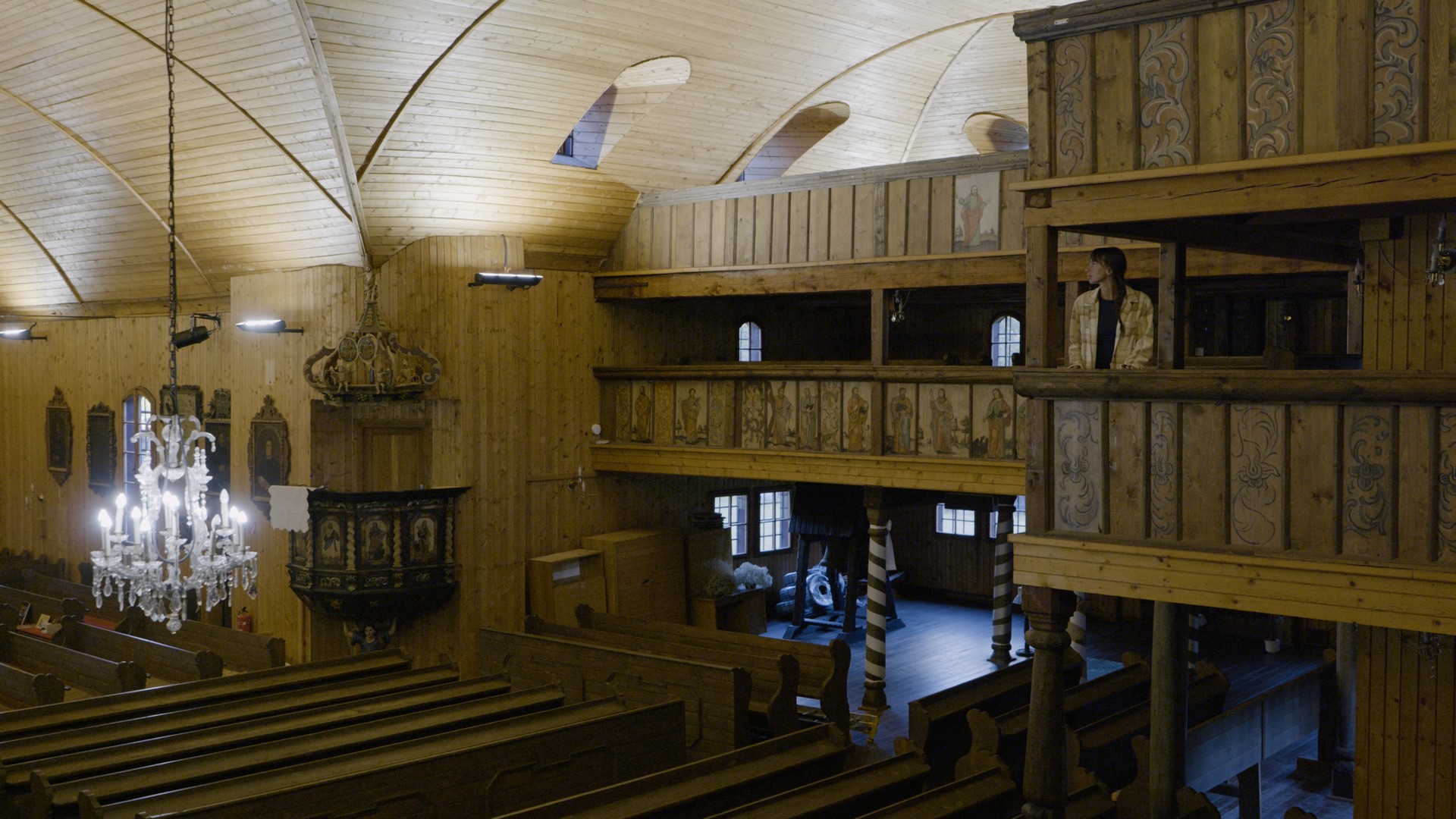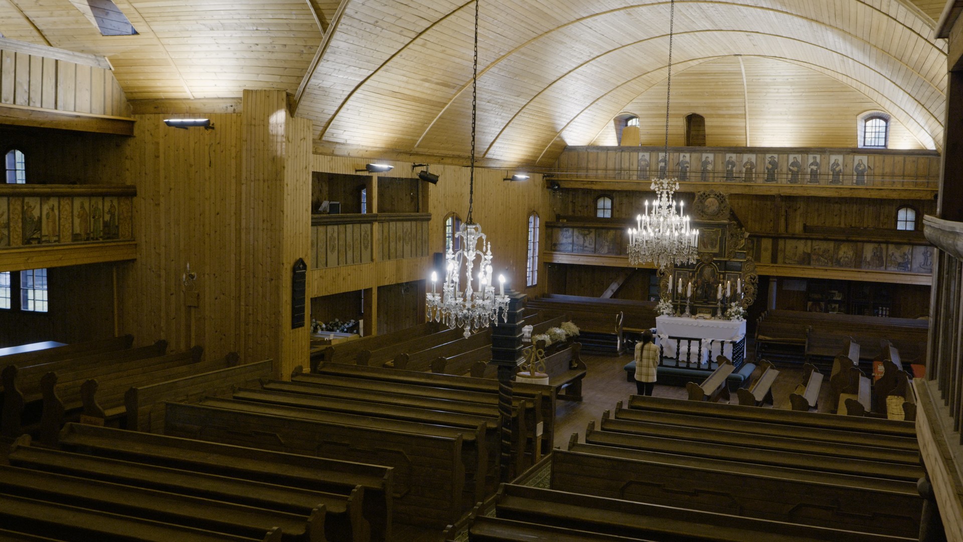 The two-storied choir emporia in the interior of the church are adorned by Biblical paintings and along with a big chandelier of Venetian glass they create a charming atmosphere. Part of the church is also an independently standing wooden tower serving as a belfry. It was added to the church later.