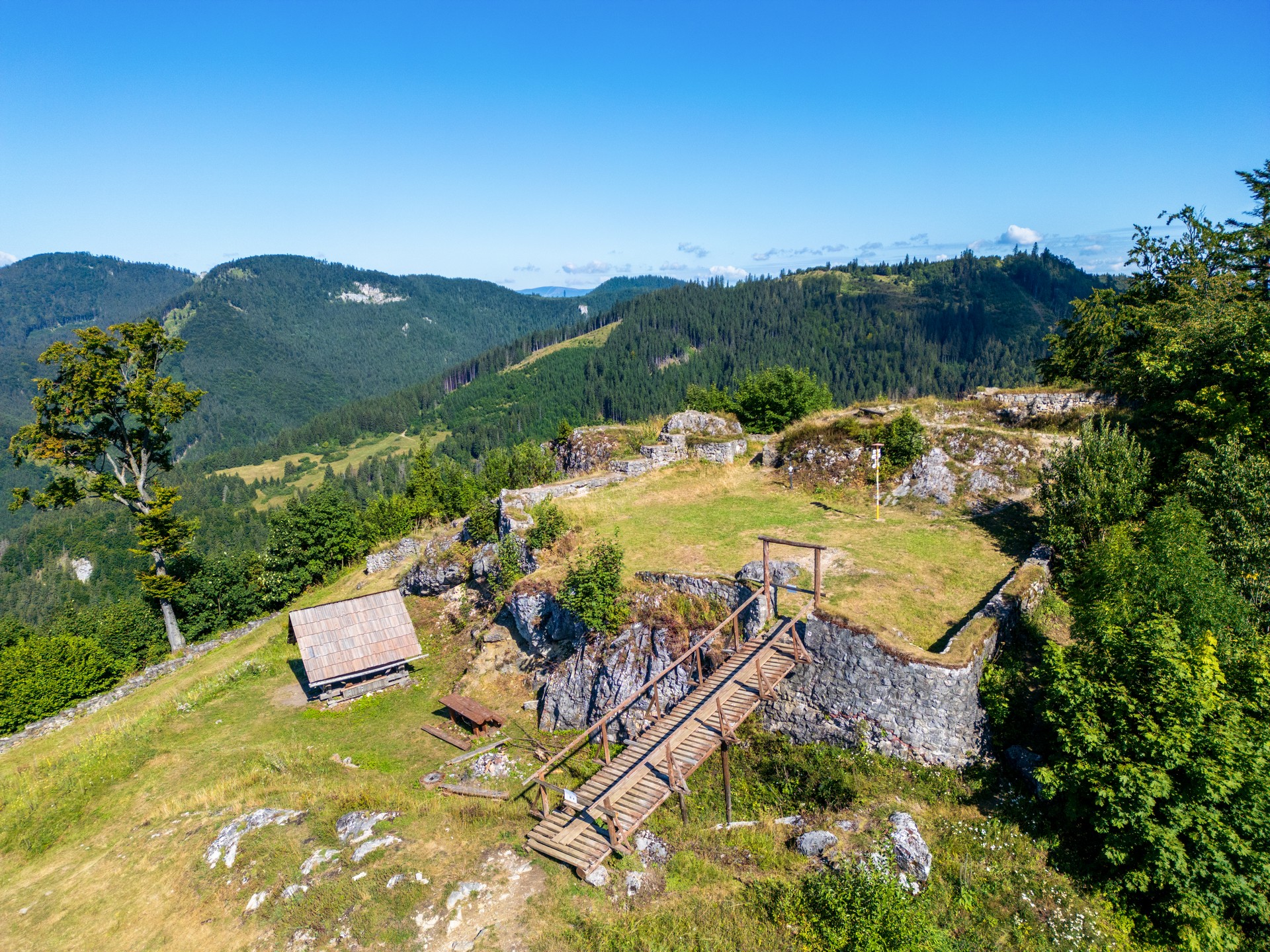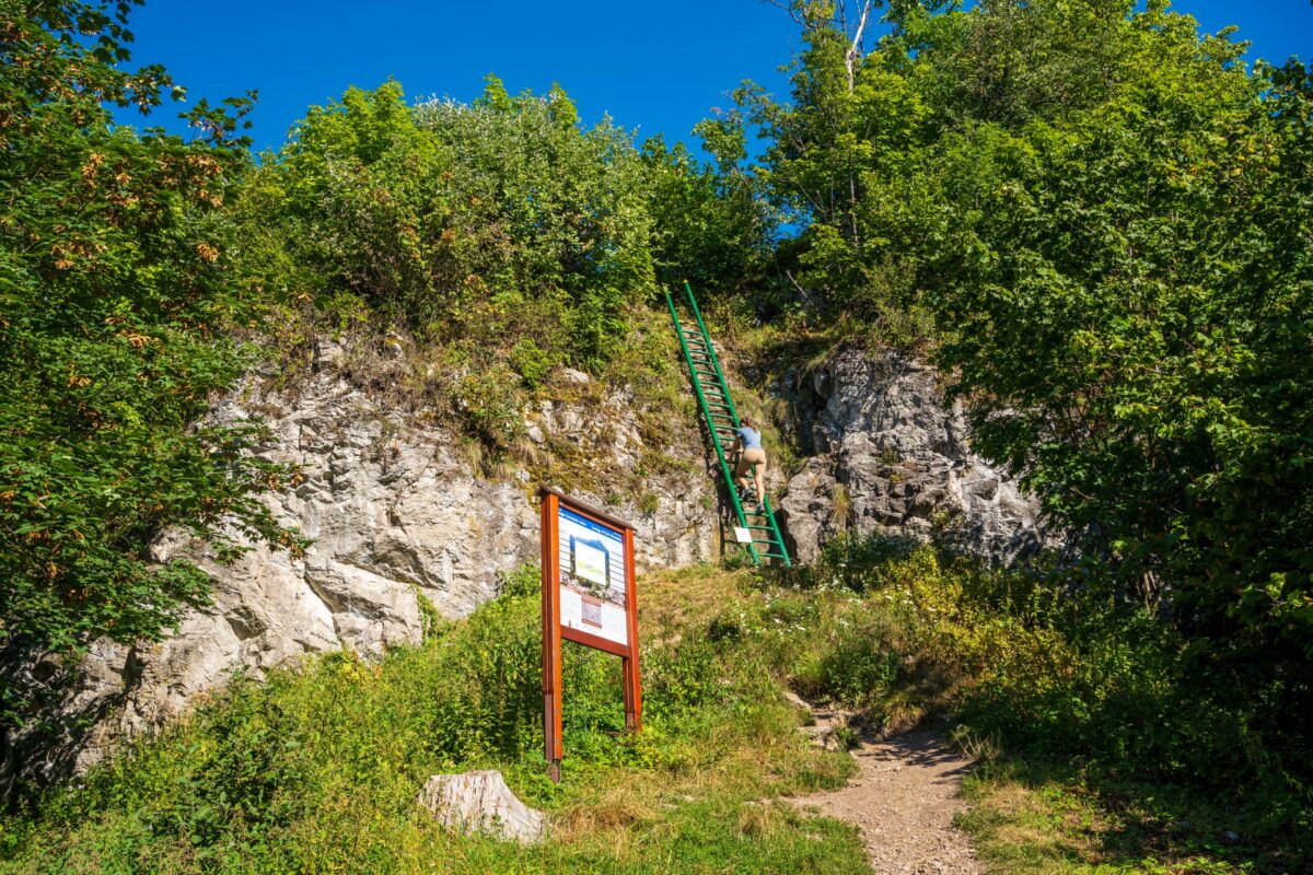 The route starts in the village of Kalameny and continues past the Kalameny lake (thermal spring), which is used for public bathing all year round. It is parallel to the yellow and, from the junction Sedlo pod Kráľová, to the red tourist sign. The route with a permanent climb leads largely outside the forest, which can be strenuous on sunny summer days. A 7 m high metal ladder and a bridge lead to the platform with the castle. There are warnings in the terrain: entry into the Liptovský Castle area is possible only at your own risk and for persons under 14 only accompanied by adults.