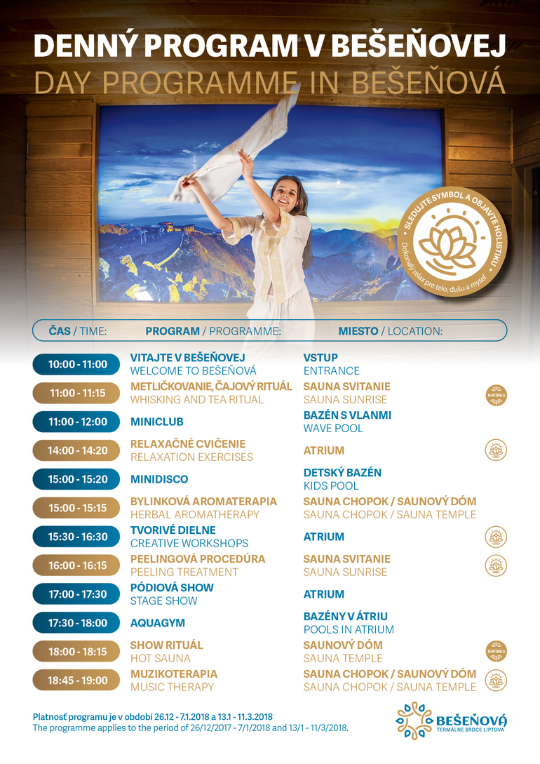 Bešeňovą opłaca się odwiedzić również zimą. Bogaty program przez cały dzień czeka na małych i dużych. Dla dzieci przygotowano różne konkursy, kwizy, miniclub, minidisco, pracownie twórcze lub aquagym w basenach. Dorośli mogą się oczywiście przyłączyć. Dla nich mamy jednak coś specjalnego – rytuały saunowe.