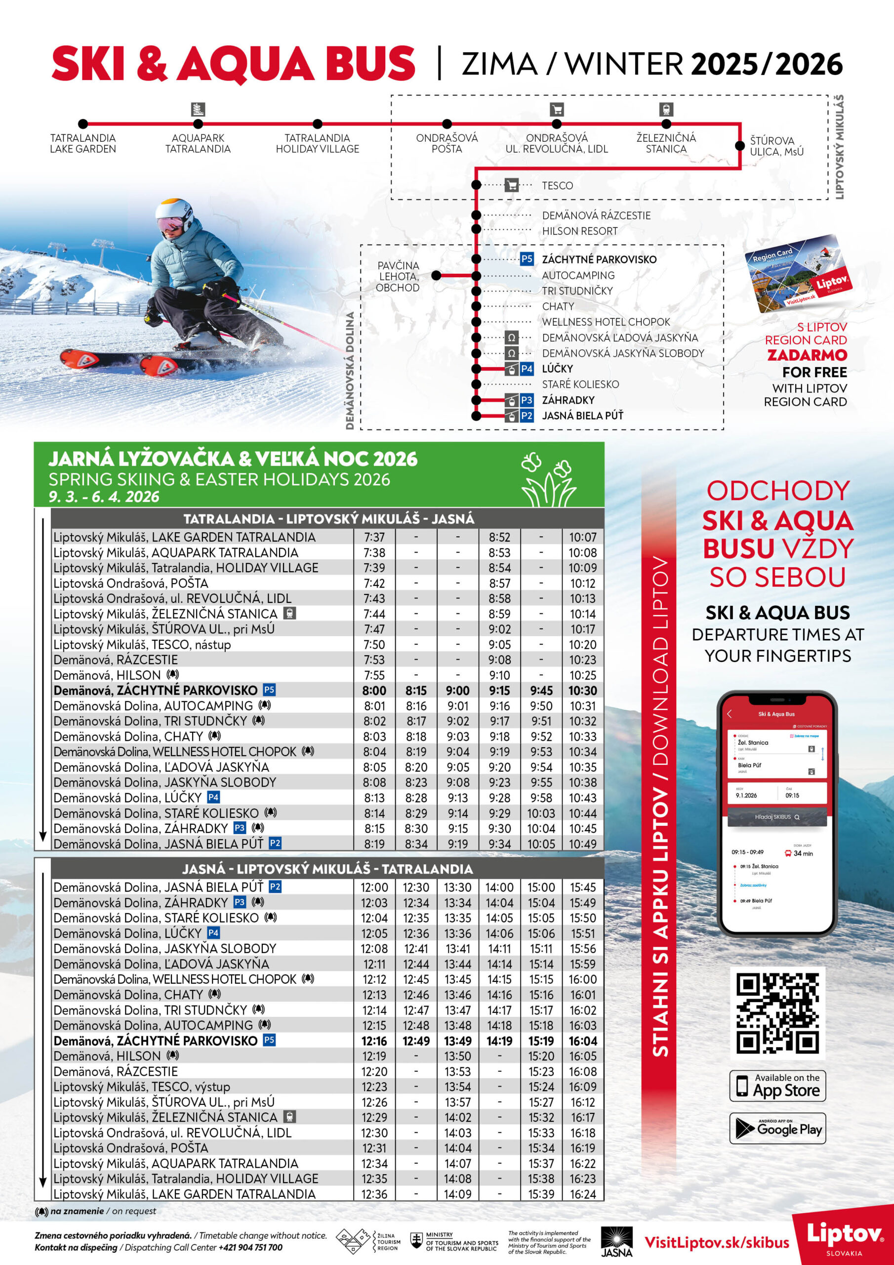 Na Liptove premáva počas zimnej sezóny pravidelná bezplatná doprava SKI & AQUA BUS. Lyžiari a dovolenkári sa tak pohodlne zvezú na svahy, ale aj do vodného parku. Skibus-y spájajú stredisko Jasná s Liptovským Mikulášom a Tatralandiou, ako aj s Liptovským Jánom a Bešeňovou. A lyžiarske stredisko Malinô Brdo s Ružomberkom.