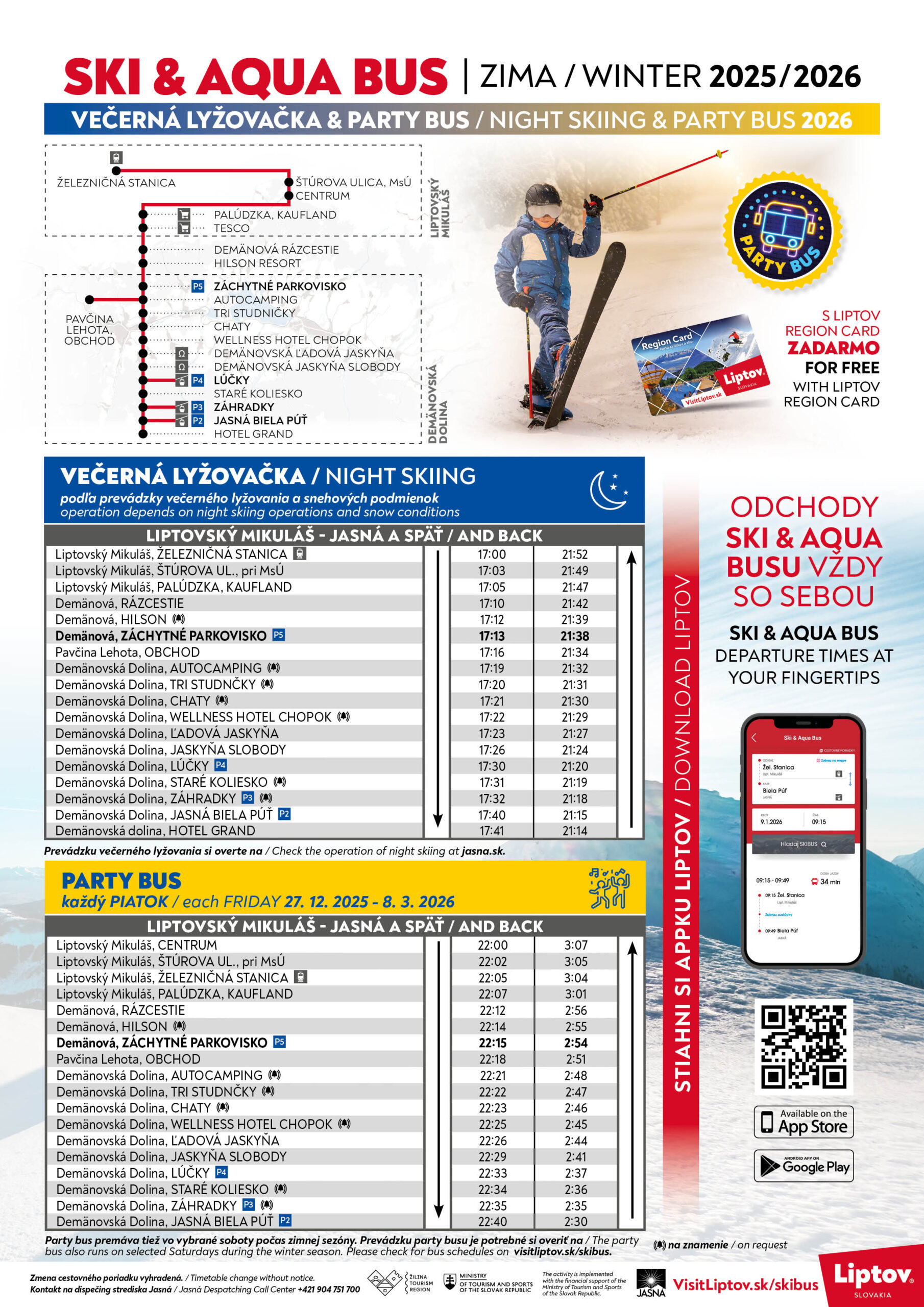 - Počas prevádzky večerného lyžovania je v premávke skibus na večerné lyžovanie do Jasnej, na osvetlenú zjazdovku ideálnu pre rodiny s deťmi!