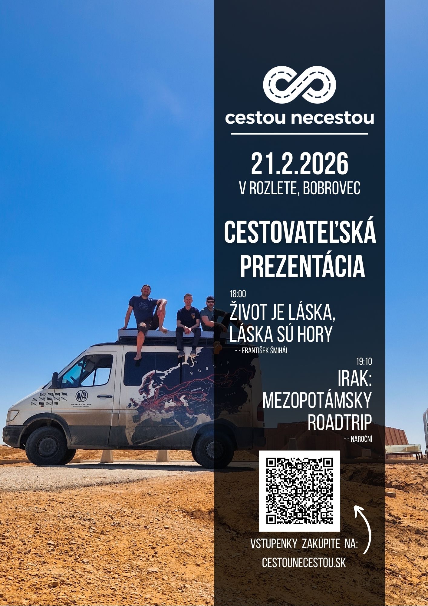 Príďte na večer plný silných príbehov a veľkých ciest. Od tatranských štítov a filozofie pohybu s Ferom Šmihálom až po 9 000 km dlhý roadtrip naprieč Irakom – krajinou histórie, kontrastov a výnimočných ľudí. Dva svety, dve cesty, jeden nezabudnuteľný večer.