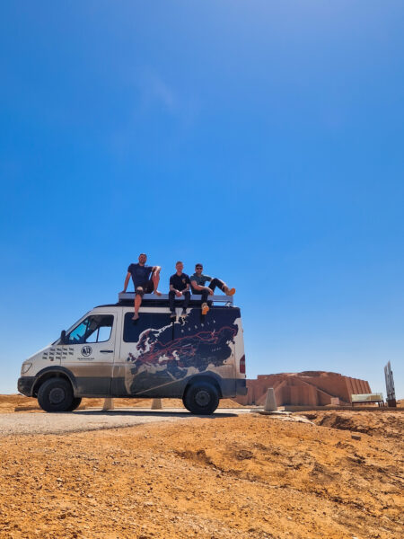 Až po náš veľký cieľ – k brehom Perzského zálivu, kde sa dotýkame Indického oceánu a symbolicky spájame štyri oceány, Atlantický, Tichý, Severný ľadový a Indický oceán na štyroch kolesách nášho 30-ročného oslávenca, ktorý to na svoje narodeniny zvláda úplne bez zaváhania. Naš Meďo – Mercedes-Benz Sprinter 208D z roku 1995.