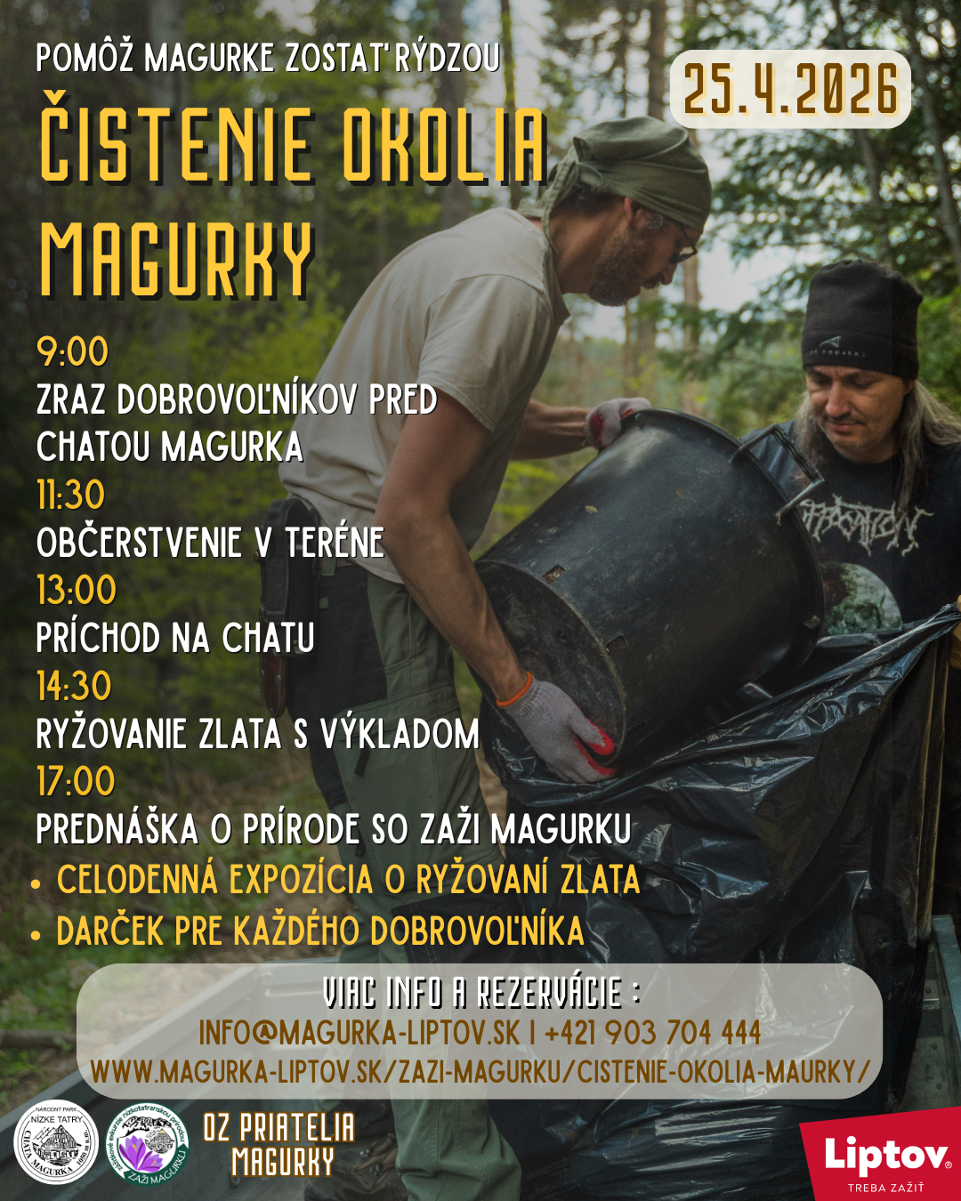 Zapojte sa pre dobrú vec a pomôžte aj vy pri dobrovoľnom čistení nelegálnej skládky v okolí Magurky. Popri tom sa dozviete niečo o baníctve na Magurke a urobíte si krátky výlet do jednej zo štôlní. Súčasťou bude aj tematická prednáška o ochrane prírody na Slovensku. Každý dobrovoľník dostane, okrem dobrého pocitu, odmenu!