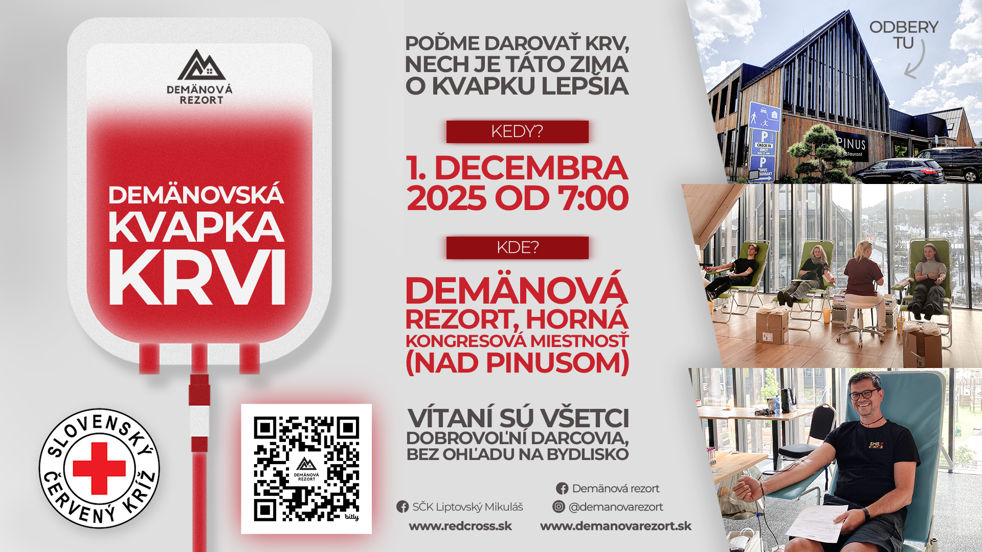 Príďte do Demänová rezort zmeniť životy. Demänová Rezort v spolupráci so Slovenským červeným krížom vás srdečne pozýva na podujatie Demänovská kvapka krvi, kde sa spoločne pokúsime pridať do života kvapku nádeje. Stačí malý krok – darovať krv – aby ste prispeli k niečomu veľkému a krásnemu. Nezáleží na tom, odkiaľ pochádzate, každý dobrovoľný darca je u nás vítaný!