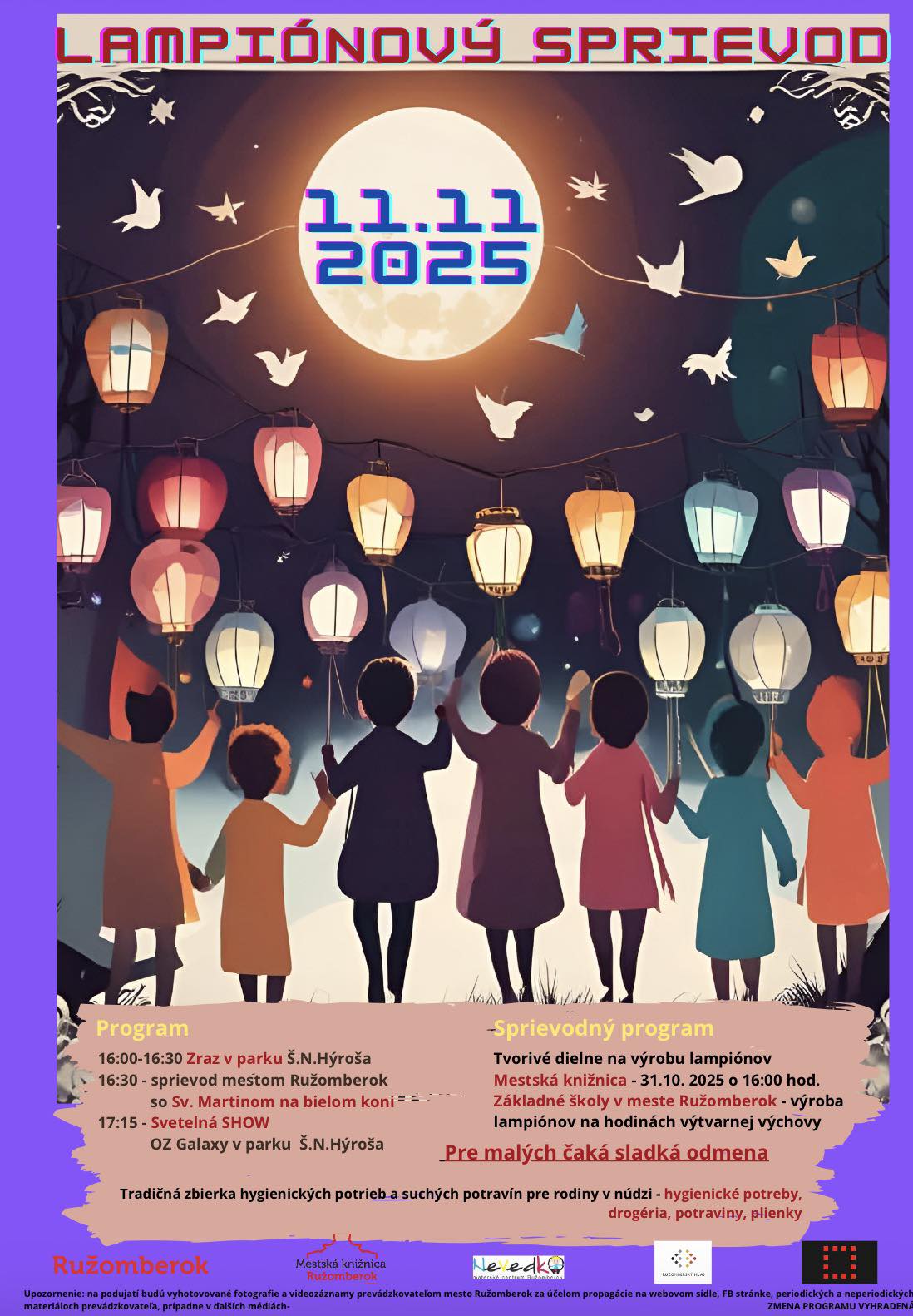 Lampiónový sprievod v Ružomberku sa uskutoční v utorok 11. novembra v Parku Š. N. Hýroša. Program začína o 16.00 hod. a tešiť sa môžete na tradičný sprievod mestom so sv. Martinom na bielom koni a svetelnú šou OZ Galaxy. Súčasťou sú aj tvorivé dielne, ktoré sú prípravou na samotné podujatie. V Mestskej knižnici v Ružomberku si budú môcť vaše deti vlastnoručne vyrobiť lampión, rovnaká aktivita bude prebiehať aj na mestských základných školách počas hodín výtvarnej výchovy.
