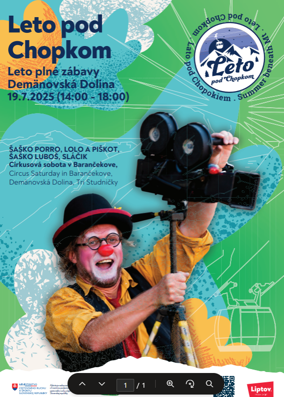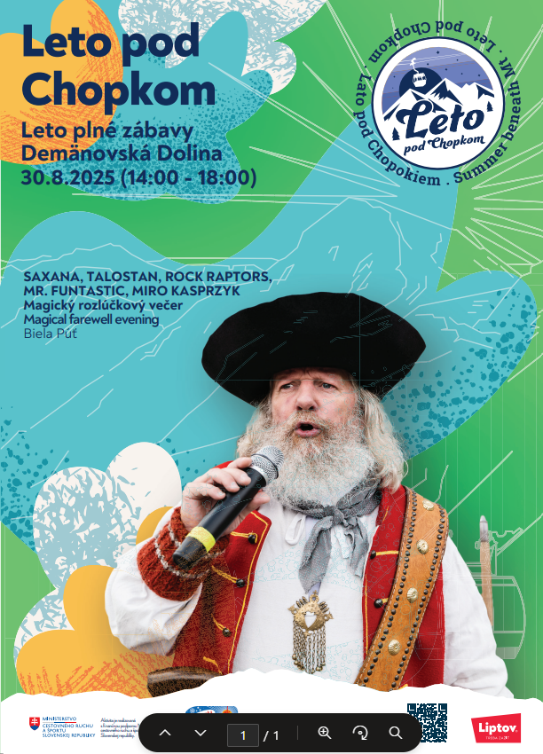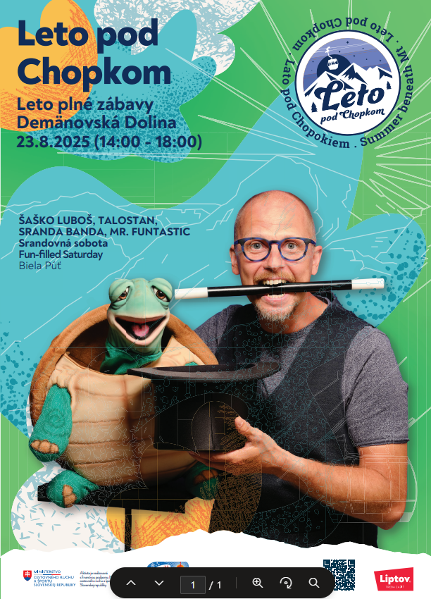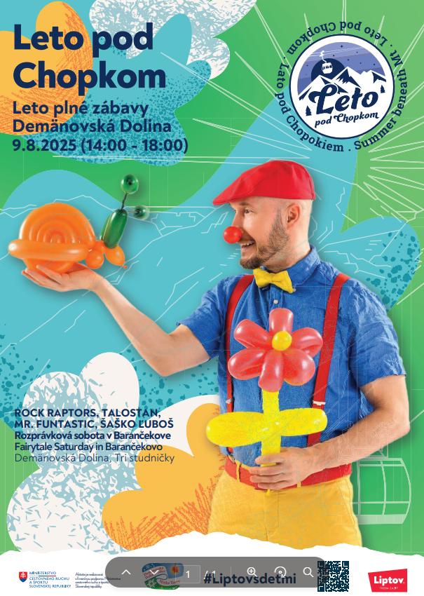 Začnite leto pod Chopkom! Od 10:00 do 15:00 na vás čaká bohatý program pre deti: vedecké workshopy pre deti, maľovanie na tvár, penová párty, karikaturista, skákacie hrady, detské súťaže a tvorivé dielne, ukážky Horskej služby, hasičskej techniky, polície a o 15:00 koncert Dúhalky.
