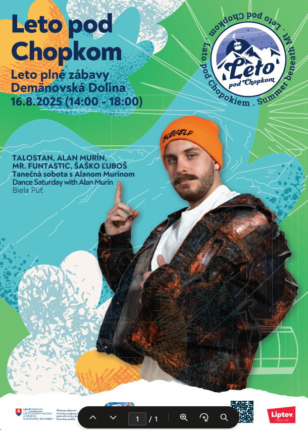 Tanečná sobota 16.8., ktorá sa odohrá v Jasnej, na Bielej Púti, bude v znamení letných hitov a zábavy. Kúzelník Talostan, Šaško Ľuboš a Mr. FUNtastic sa postarajú, aby sa žiadne dieťatko nenudilo. Rapper, spevák a autor hitov ako „Domov“, či „Raz dva tri“, Alan Murin príde roztancovať a zakončiť už tak plne nabitý deň.