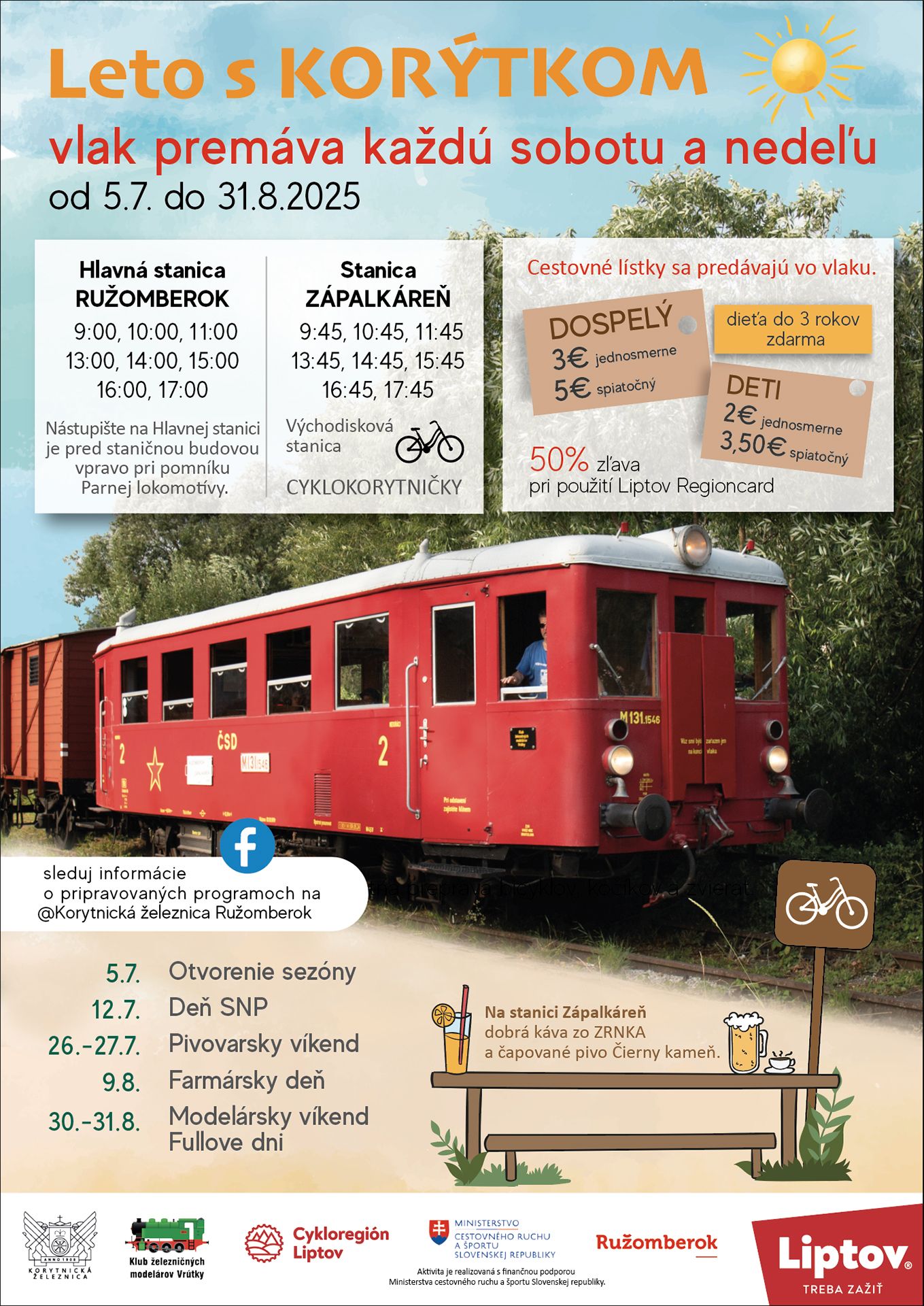 Korýtko je tu opäť aj túto letnú sezónu. Jazdí počas letných prázdninových víkendov. Korýtko, to je parádna nostalgická atmosféra, historický vlak, výhľady aj letné prekvapenia pre celú rodinu. Aj tento rok na vás čaká niekoľko sprievodných tematických podujatí, na ktoré ste srdečne pozvaní.