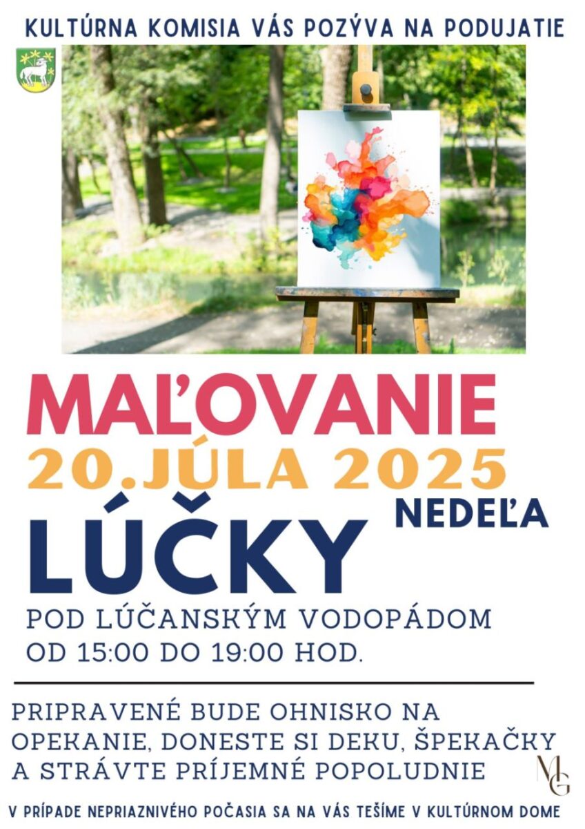 Kultúrna komisia v Lúčkach vás pozýva na Maľovanie pod Lúčanským vodopádom. Pripravené bude ohnisko na opekanie. Doneste si deku, špekačky a strávte príjemné popoludnie. Pripravené bude ohnisko na opekanie, preto si prineste deku, špekačky a strávte príjemné popoludnie.