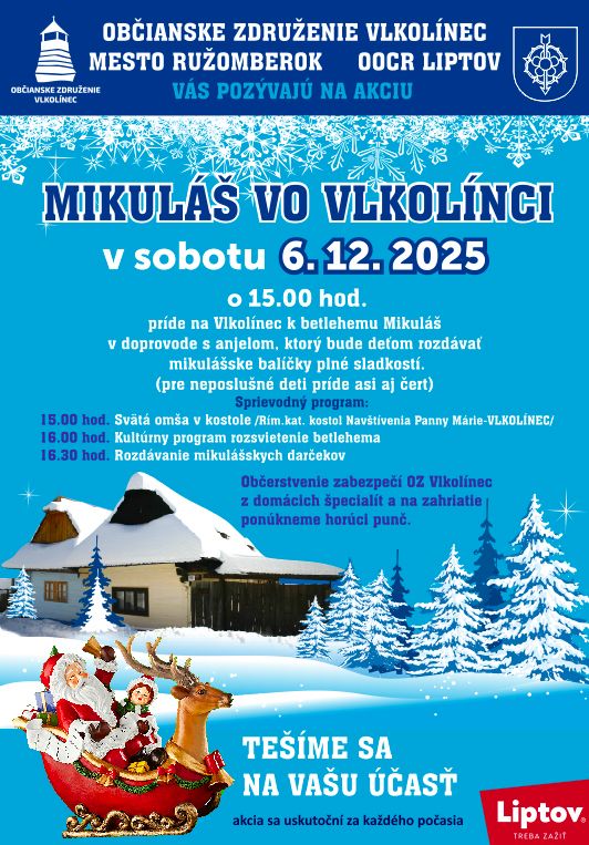 Zažite mikulášsku atmosféru vo Vlkolínci. O 15:00 hod. príde do Vlkolínca k betlehemu Mikuláš spolu s anjelom. Deťom budú rozdávať mikulášske balíčky plné sladkostí. Pre neposlušné deti príde možno aj čert.