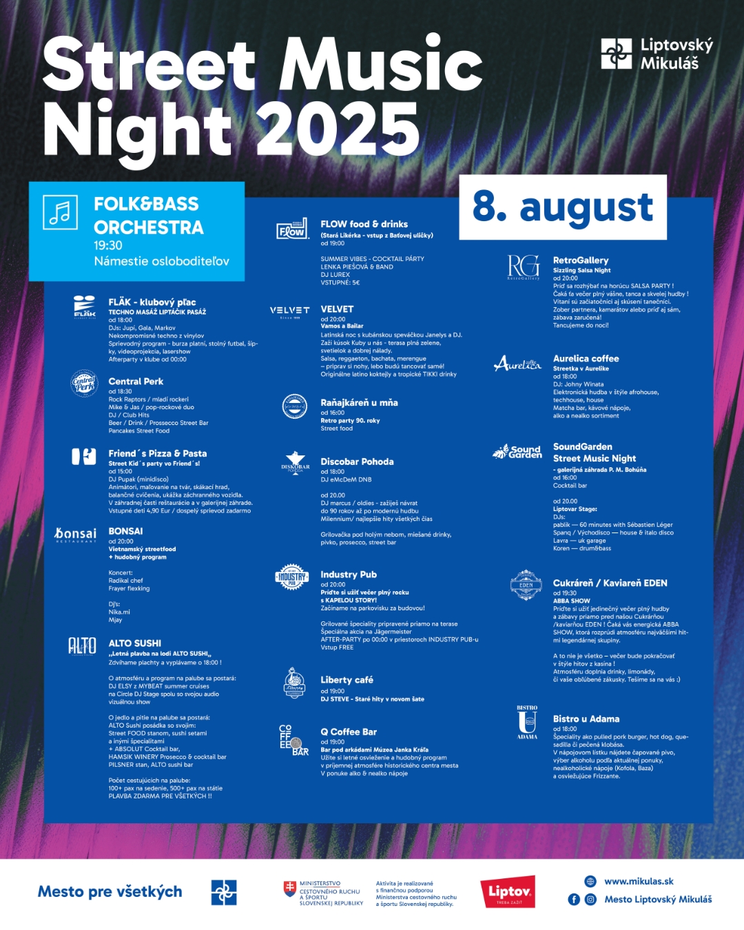 Ulice mesta opäť ožijú hudbou, tancom a skvelou atmosférou. Pripravte sa na živé koncerty, DJ sety, zábavu v podnikoch, dobré jedlo a letnú náladu, akú zažijete len raz za rok.