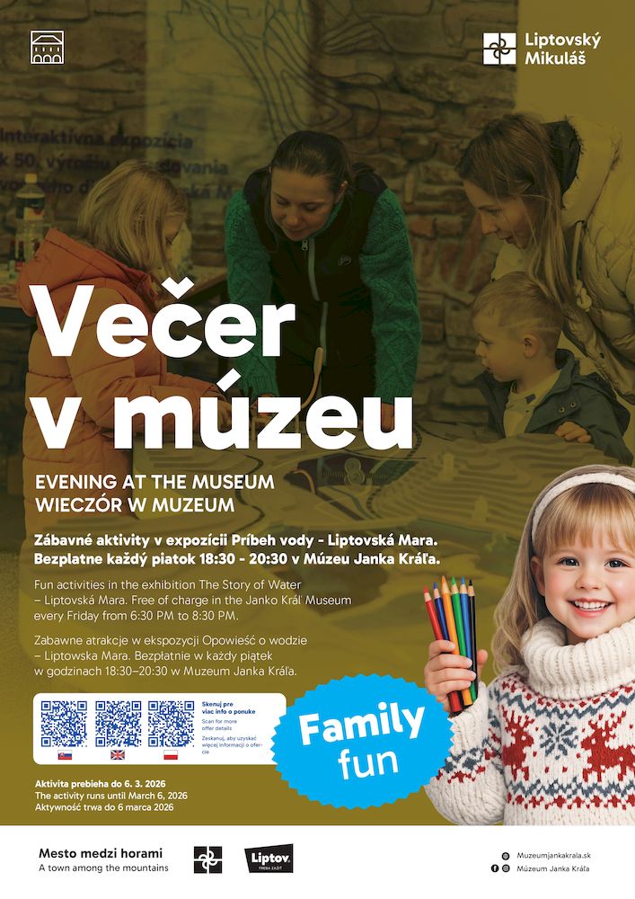 Zažite skvelé piatkové večery plné zábavy, poznania a objavovania. Interaktívna expozícia Príbeh vody – Liptovská Mara vás vtiahne do tajomstiev, ktoré ukrýva pod svojou hladinou. V priestore s veľkolepou maketou Liptovskej Mary sa deti zmenia na skutočných pátračov. Prostredníctvom slepej mapy odhalia príbehy známych miest a zákutí, ktoré tvoria dnešnú podobu vodného diela. Spoznajú rastliny a zvieratá žijúce pri vodnej nádrži a zistia, čo všetko ukrýva krajina pohltená vodou.