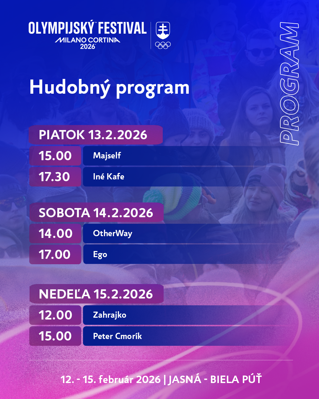 10:00-16:00 Otvorenie areálu, športovísk, aktivít a jednotlivých zón (Jasná, Biela Púť)