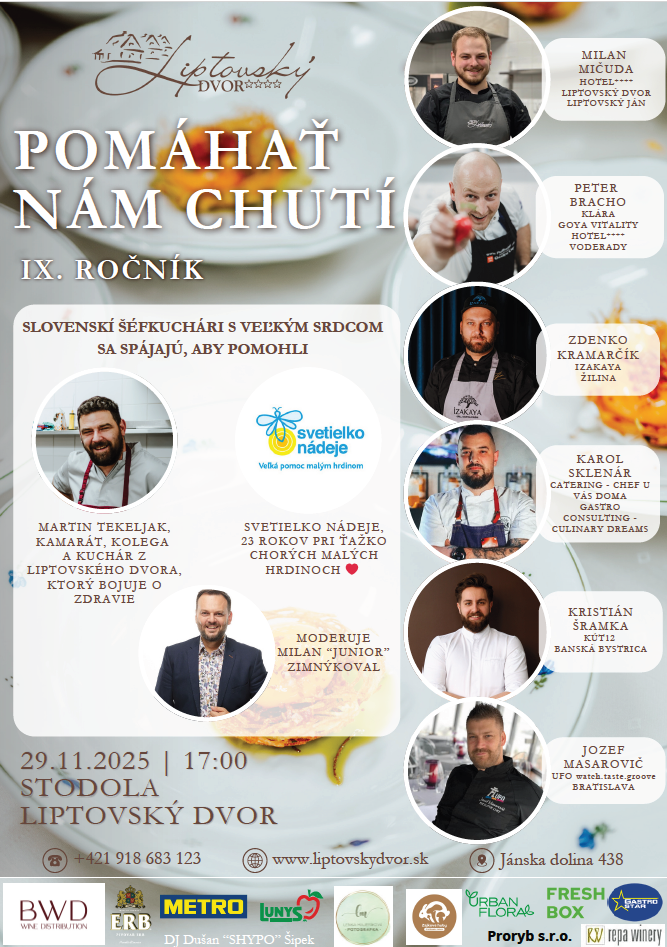 Na Liptovský dvor sa opäť po roku vracia kulinársky súboj „Pomáhať nám chutí“. Je nielen o gastronomickom zážitku, ktorý vám doprajú skvelí slovenskí šéfkuchári, ale hlavne o pomoci iným. O pomoci tým, ktorým život skomplikovala vážna choroba. Práve im poputuje výťažok za degustačné menu, pripravené a naservírované týmito šéfkuchármi. Hostia sa tak rozhodnú, ktoré menu podporia a akou finančnou čiastkou.