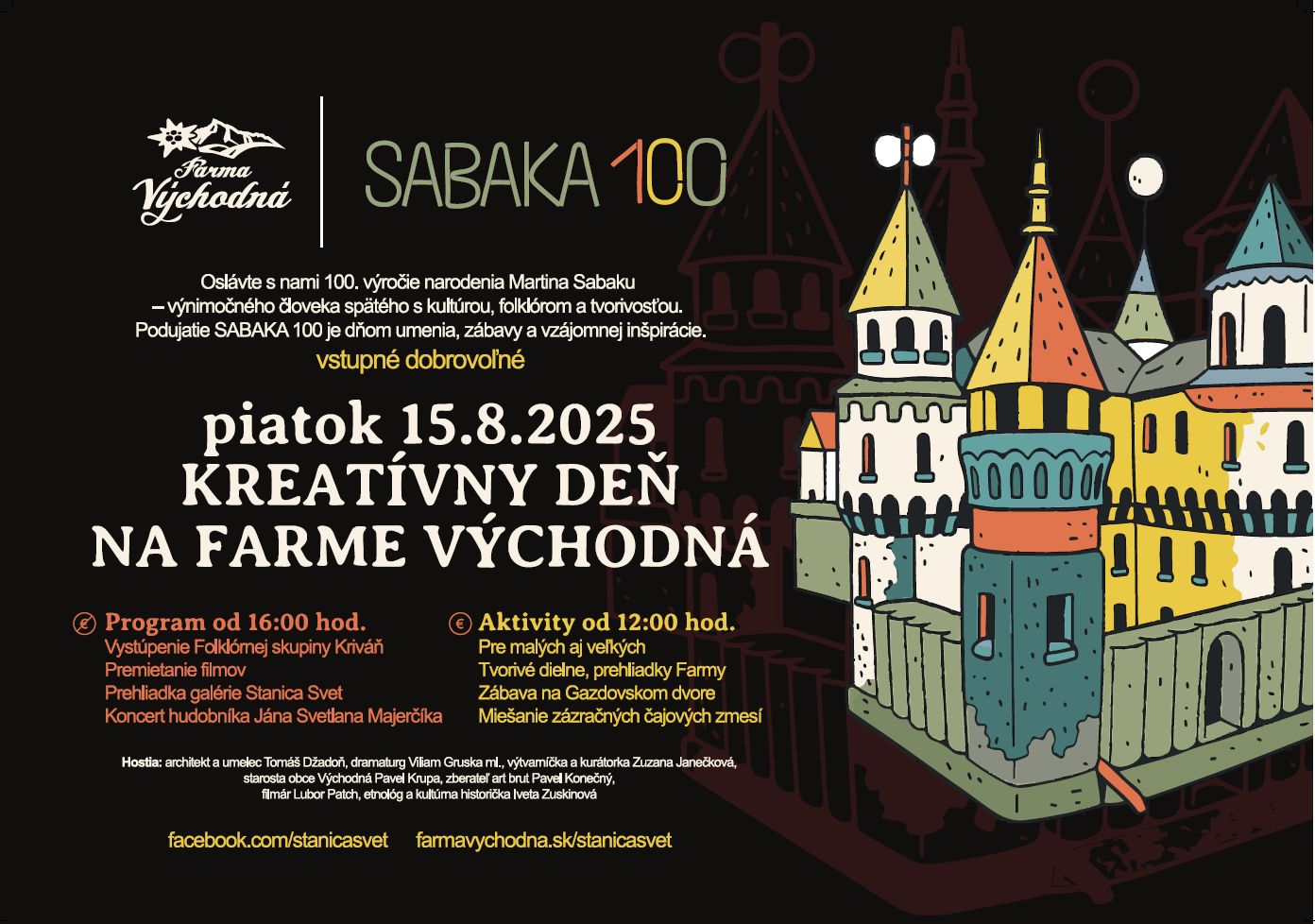 Oslávte s nami 100. výročie narodenia Martina Sabaku – výnimočného človeka spätého s kultúrou, folklórom a tvorivosťou. Podujatie SABAA 100 je dňom umenia, zábavy a vzájomnej inšpirácie.