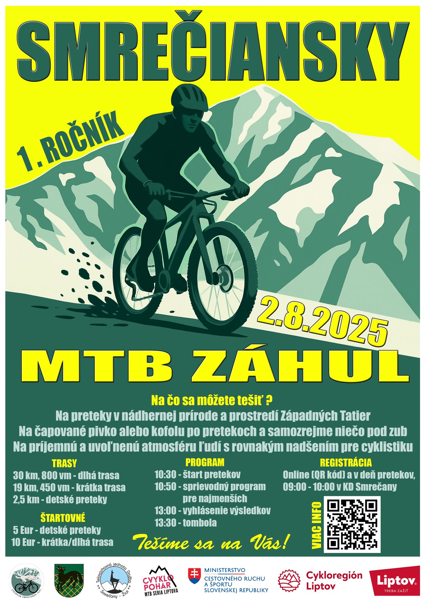 Po vydarenom nultom ročníku by sme vás radi pozvali na 1.ročník MTB pretekov Smrečiansky záhul, ktorý sa uskutoční v sobotu 2.8.2025 so štartom v Smrečanoch. Čaká na Vás pohodová atmosféra, trasa pretekov v nádhernom prostredí Západných Tatier, občerstvenie po pretekoch a kopec ďalších zážitkov.