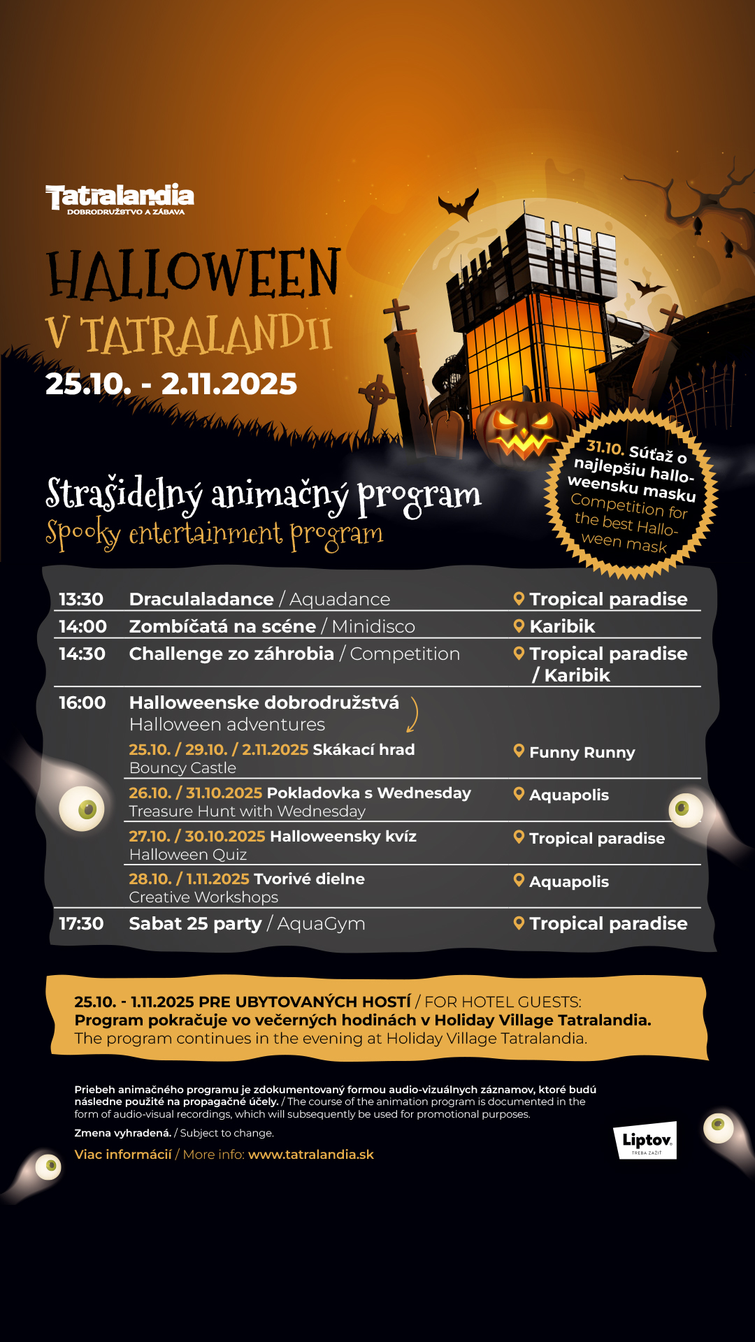 Od 25. 10. do 2. 11. 2025 sa Tatralandia premení na čarovný svet plný tajomnej atmosféry a zábavy, ktorá vás vtiahne do halloweenskeho dobrodružstva a prinesie nezabudnuteľné chvíle plné smiechu, radosti a jedinečných zážitkov.