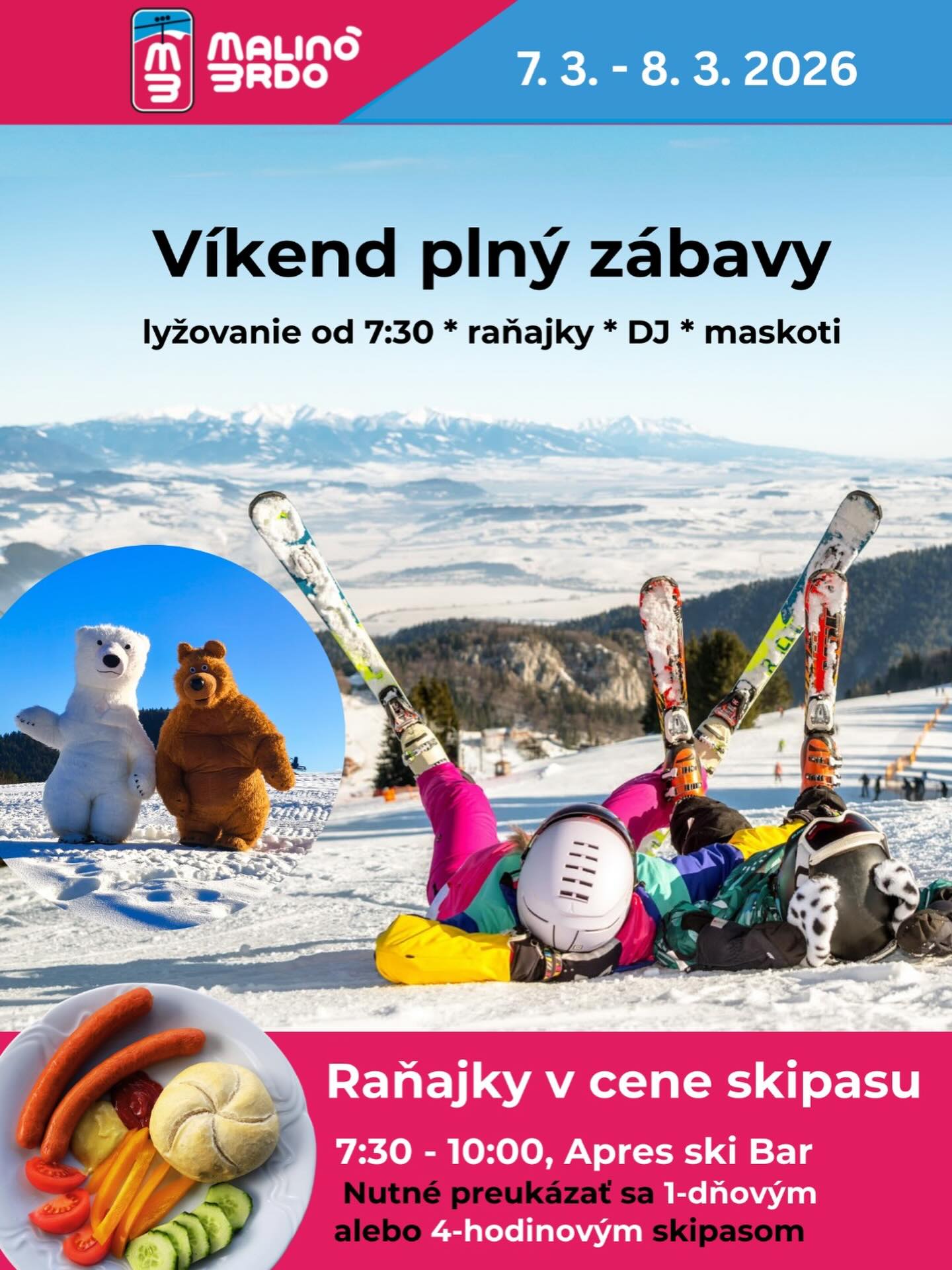 Príďte stráviť krásne aktívne dni na lyžiach alebo snowboarde na Malinô Brdo. Navyše – k 1-dňovému a 4-hodinovému skipasu dostanete raňajky priamo v Apres ski bare, kde sa môžete slniť pri hudbe DJ-a. A ak si objednáte pivko či prossecco, možno vám ho prinesú aj dvaja medvedí maskoti, ktorí tam rovnako počas víkendu rozprúdia zábavu.