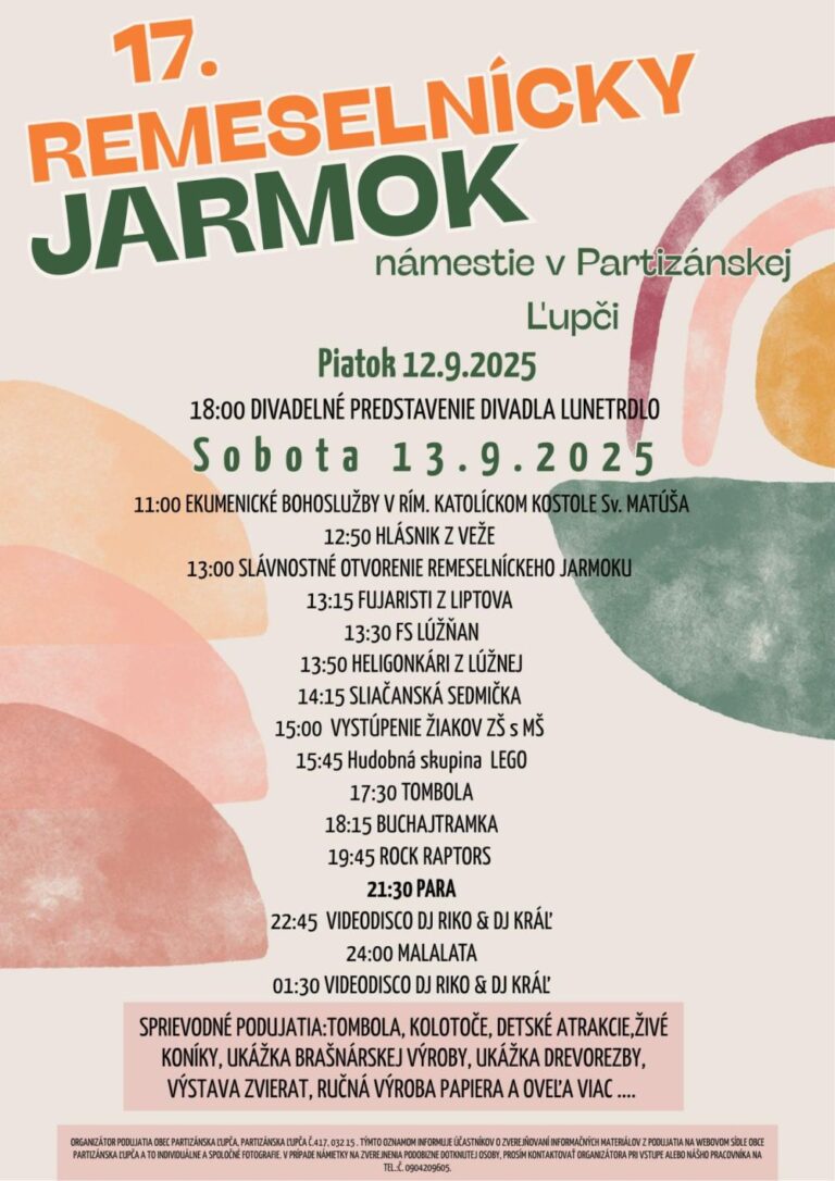 Obec Partizánska Ľupča vás srdečne pozýva na XVII. Remeselnícky jarmok. Remeselnícky jarmok v Partizánskej Ľupči nie je len trhom – je to oslava tradícií, spolupatričnosti a radosti zo spoločného stretnutia. Je to miesto, kde sa minulosť prirodzene prelína so súčasnosťou a kde sa každý cíti vítaný.