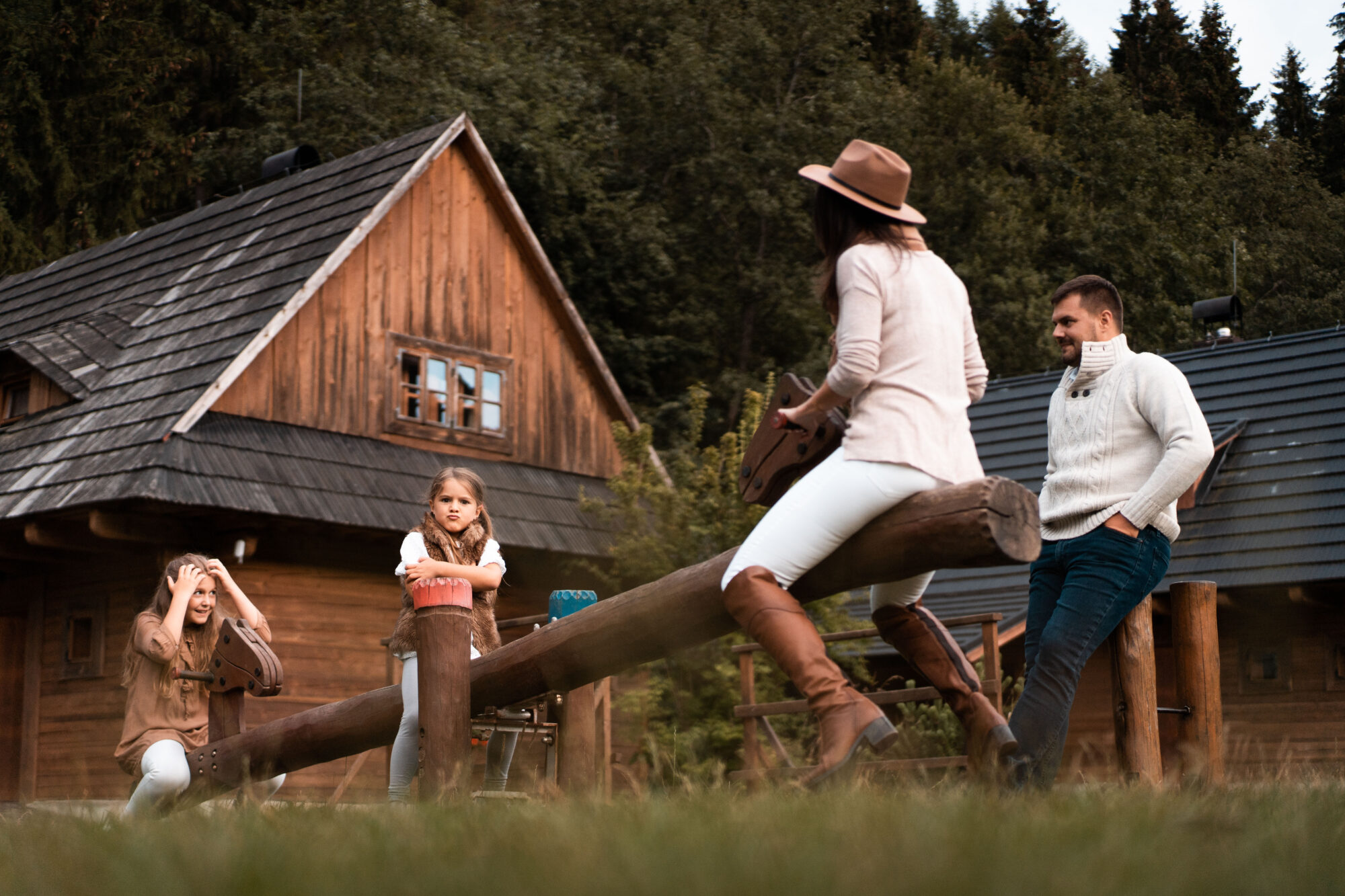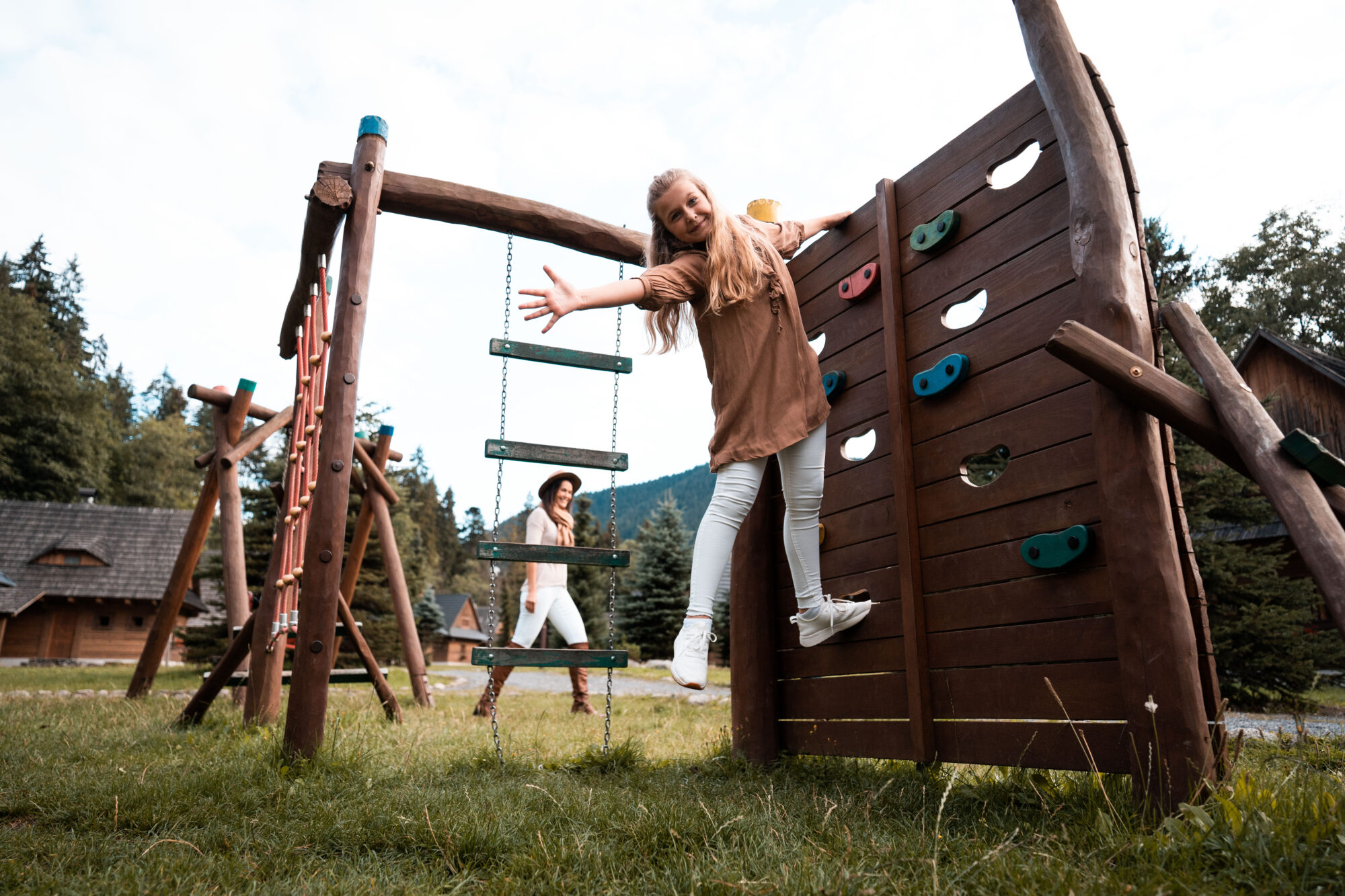 - Ubytovanie v súkromí dreveničiek, ktoré sú vybavené dvoma samostatnými spálňami, dvoma kúpeľňami, útulnou obývačkou s krbom a jedálenským kútom priamo uprostred prírody